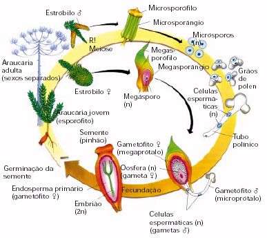 Quando o microgametófito contido num grão de pólen entra em contato com um macroesponrângio, ocorre a polinização. O grão de pólen lança o tubo polínico, pelo qual migram os núcleos espermáticos, que entram em contato com as células do macrogametófito para iniciar a fecundação. Nas gimnospermas, três dos núcleos do microgametófito degeneram e o restante se funde com o óvulo para formar o zigoto. Nas angiospermas, um dos núcleos espermáticos se une ao óvulo (a célula central de um dos polos) e o outro se funde com os dois núcleos da célula central, assim se constitui o endosperma, tecido de reserva que serve de nutriente ao embrião durante seu desenvolvimento.